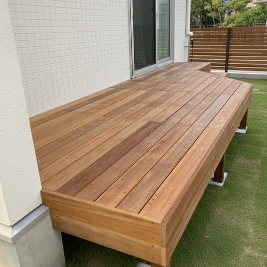 ウッドデッキの材料は天然木「ハードウッド」を使用します。耐久性・耐腐食性は木材の中でもトップクラスで、腐れや虫害、湿気に強く20〜30年以上の耐久性を誇ります。ハードウッドにはいくつかの種類があり、ご予算に合わせたご提案が可能です。